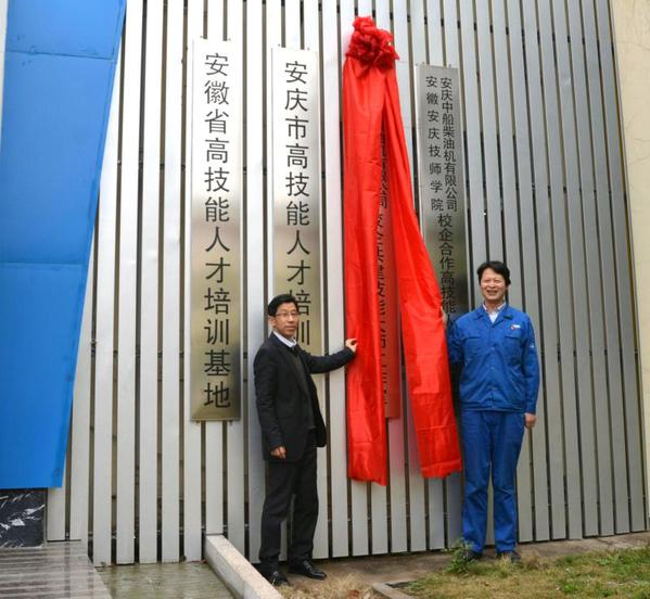 在中船柴油機有限公司調研時,畢明生和公司總工程師張仕明共同為校企共建的技能大師工作室揭牌。