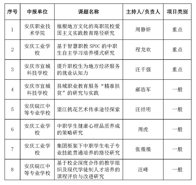 根據《安慶職業教育集團關于做好2020年教學改革研究課題申報工作的通知》文件精神,經個人申報、學校推薦,集團秘書處按照相關程序組織形式審查、專家評審,現對集團2020教學改革研究課題擬立項名單進行公示。