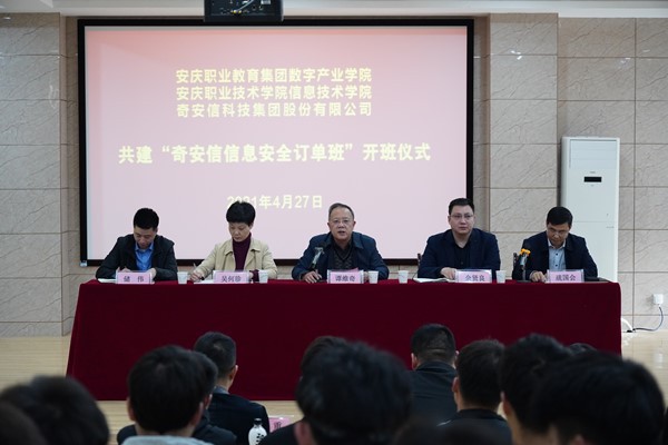 4月27日下午,由安慶職教集團數字產業學院、安慶職業技術學院信息技術學院與奇安信科技集團股份有限公司合作共建的數字產業學院首屆“奇安信信息安全訂單班”開班典禮在2號教學樓216教室隆重舉行。