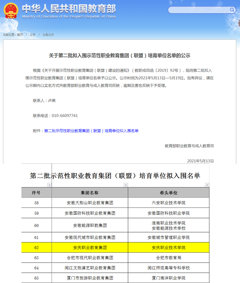 5月13日,教育部職業(yè)教育與成人教育司公示了第二批擬入圍示范性職業(yè)教育集團(聯(lián)盟)培育單位名單,安慶職業(yè)教育集團榜上有名。