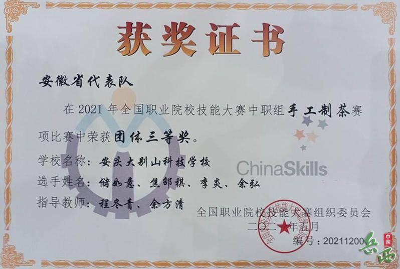 安慶大別山科技學校在2021年全國職業院校技能大賽(中職組)手工制茶項目比賽中榮獲團體三等獎,該校學生焦邵祺、余弘、儲如意、李炎4名選手參賽。