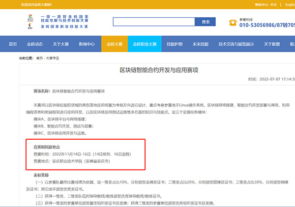 7月7日,從一帶一路暨金磚國家技能發展與技術創新大賽/金磚國家職業技能大賽官網傳來消息,安慶職業技術學院申報的“2022一帶一路暨金磚國家技能發展與技術創新大賽——區塊鏈智能合約開發與應用賽項”國內賽承辦校資格成功獲批,網站同步公布了《報名通知》和《競賽規程》。
