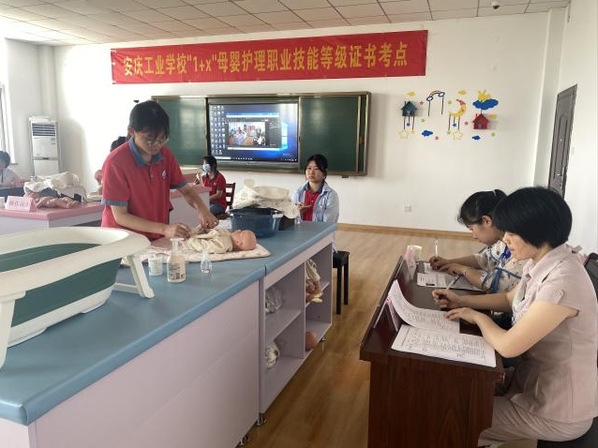 2022年6月11日上午教育部1+X母嬰護理職業技能等級證書考試在安慶專業學校實訓樓舉行。本次考試由教育部認證的第三方機構——山東陽光大姐服務有限公司考評站與工業學校共同負責實施,圓滿完成了 36名學前教育專業在校學生的考證工作。考務安排井然有序,得到了考評領導和專家的一致好評。