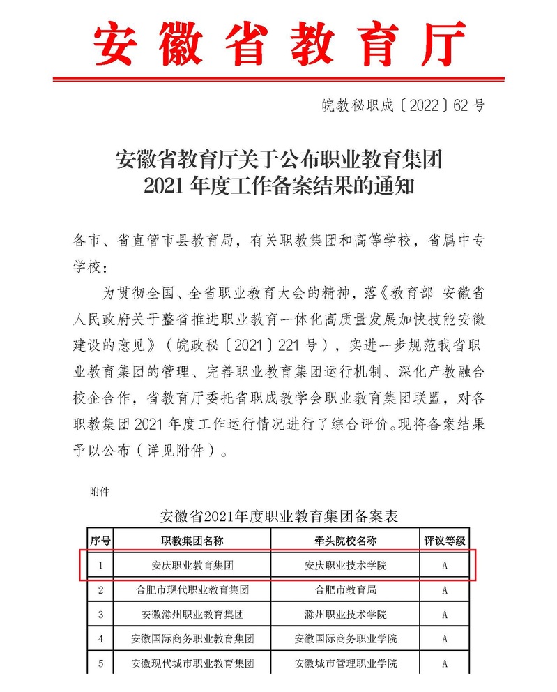 近日,省教育廳發(fā)出通報(bào)文件,安慶職教集團(tuán)在全省54家職教集團(tuán)2021年度工作運(yùn)行情況綜合評(píng)價(jià)中,以總分第一名成績(jī)獲評(píng)安徽省A類職教集團(tuán),實(shí)現(xiàn)連續(xù)四年榮獲安徽省A類職教集團(tuán)榮譽(yù)。