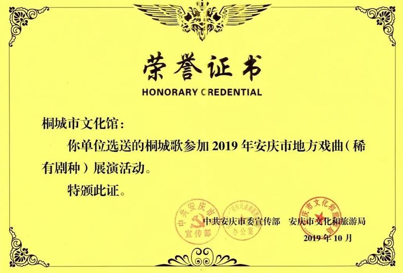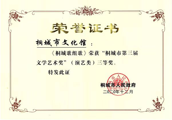 市文化館攜手中華職校開展豐富的“桐城歌”傳承傳習活動,組織業(yè)務(wù)人員對學(xué)生們的聲腔、方言、舞蹈動作進行專業(yè)系統(tǒng)培訓(xùn),演繹富有鄉(xiāng)土氣息的桐城歌音樂作品《桐城歌組歌》。201910月作品入選參加由中共安慶市委宣傳部、安慶市文化和旅游局舉辦的2019年安慶市地方戲曲(稀有劇種)展演活動,獲得一致好評;202012月作品獲桐城市人民政府頒發(fā)的“第三屆文學(xué)藝術(shù)獎”(演藝類)三等獎。