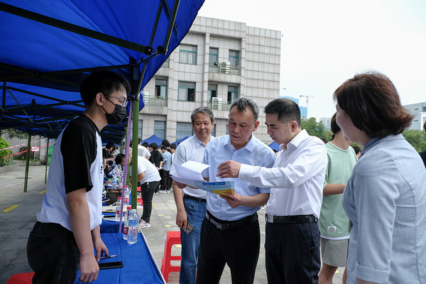 校黨委書記童宏葵、黨委副書記李克讓、安慶市人力資源和社會保障局副局長方敏、市公共就業創業服務中心主任王中群,到雙選會現場指導,了解學生們的求職意向和企業的用工需求。