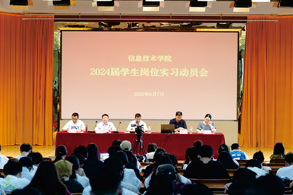 為落實學校關于畢業生崗位實習管理規定,強化實習管理,確保實習質量,6月7日下午,安慶職業技術學院信息技術學院2024屆畢業生崗位實習動員暨就業招聘會隆重舉行。主會場設在圖文信息中心一樓報告廳,二號教學樓216報告廳、各智慧教室設分會場,學生通過網絡直播同步收看。信息技術學院內設機構負責人、專業建設負責人、相關輔導員及2024屆927名畢業生參加了動員會。該院黨總支書記、院長疏國會出席會議并講話,黨總支副書記陳富漢參加會議,副院長熊祖濤主持會議。