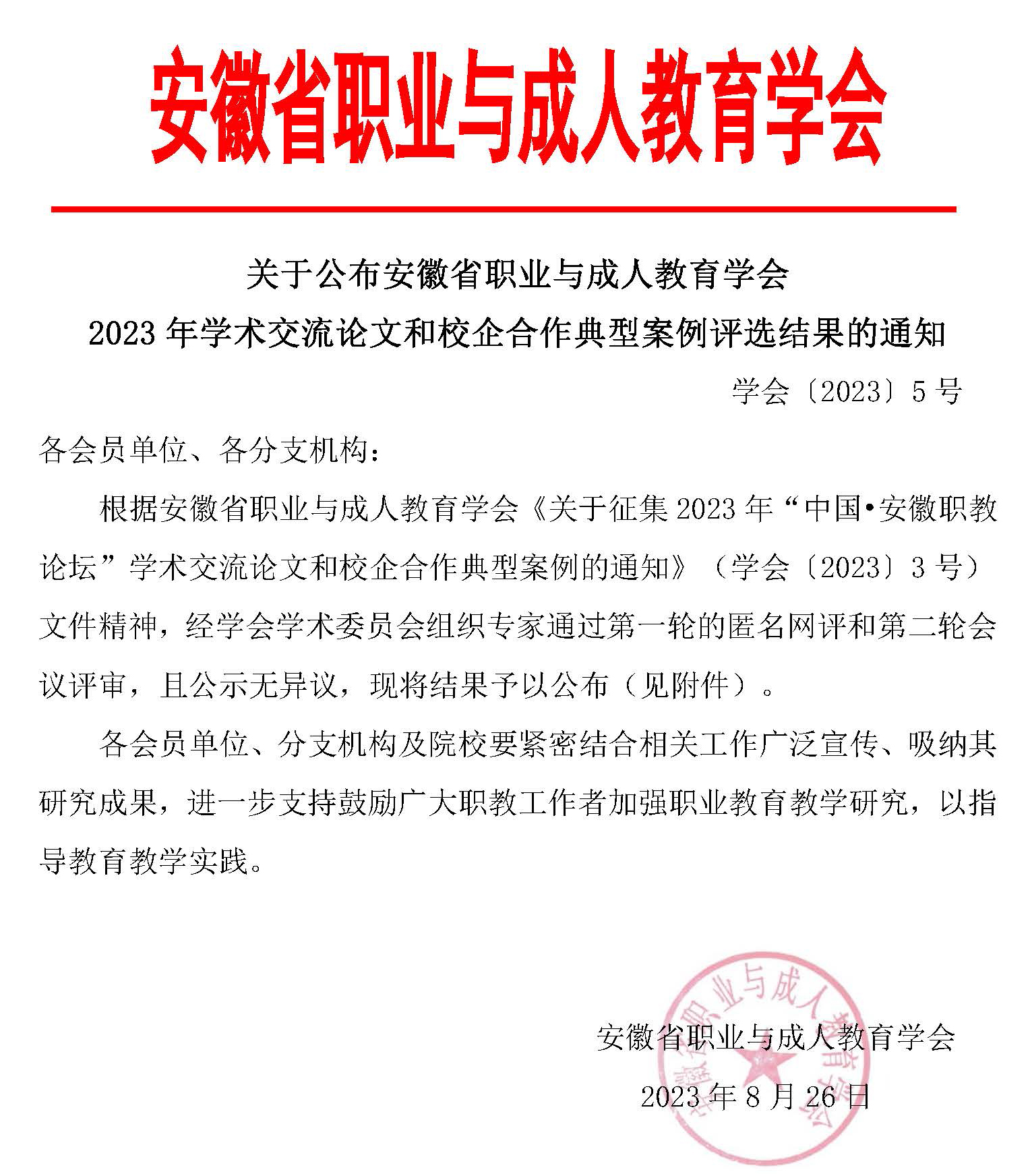 近日,安徽省職業與成人教育學會公布了2023年“中國?安徽職教論壇”交流學術論文和校企合作典型案例獲獎名單,集團9所院校共有21篇論文和8篇典型案例獲獎。(文:葛尹睿 審稿:楊元綱)