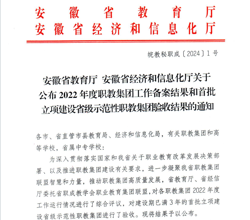 近日,安徽省教育廳、安徽省經濟和信息化廳共同發文通報我省首批立項建設省級示范性職教集團的10家職教集團驗收結果,安慶職教集團以優秀成績順利通過驗收。