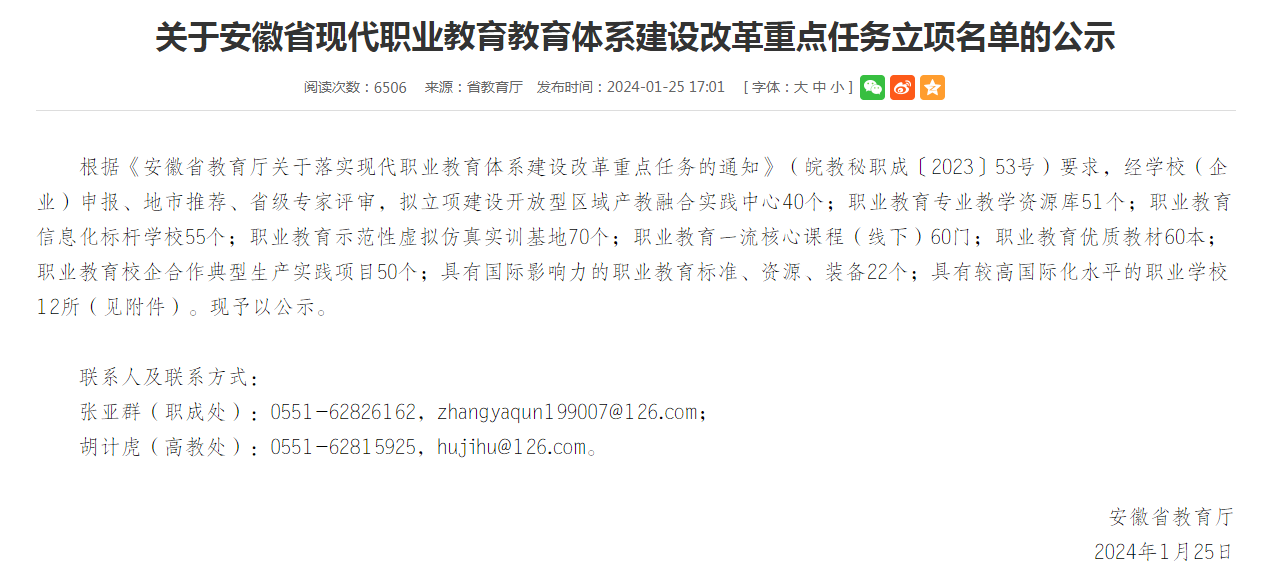 近日,安徽省教育廳發布《關于安徽省現代職業教育教育體系建設改革重點任務立項名單的公示》,集團多所院校共23個申報項目獲得立項。