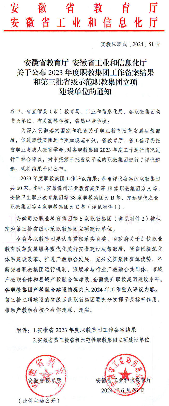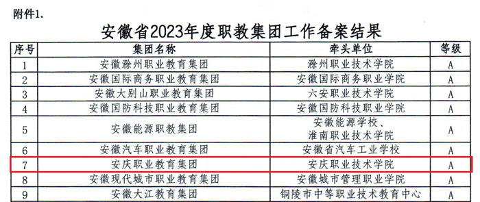 近日,安徽省教育廳、安徽省經濟和信息化廳共同發文,安慶職教集團在全省60家職教集團2023年度工作運行情況綜合評價中,以卓越的表現和顯著的成果再度獲評安徽省A類職教集團,實現連續六年榮獲安徽省A類職教集團稱號。