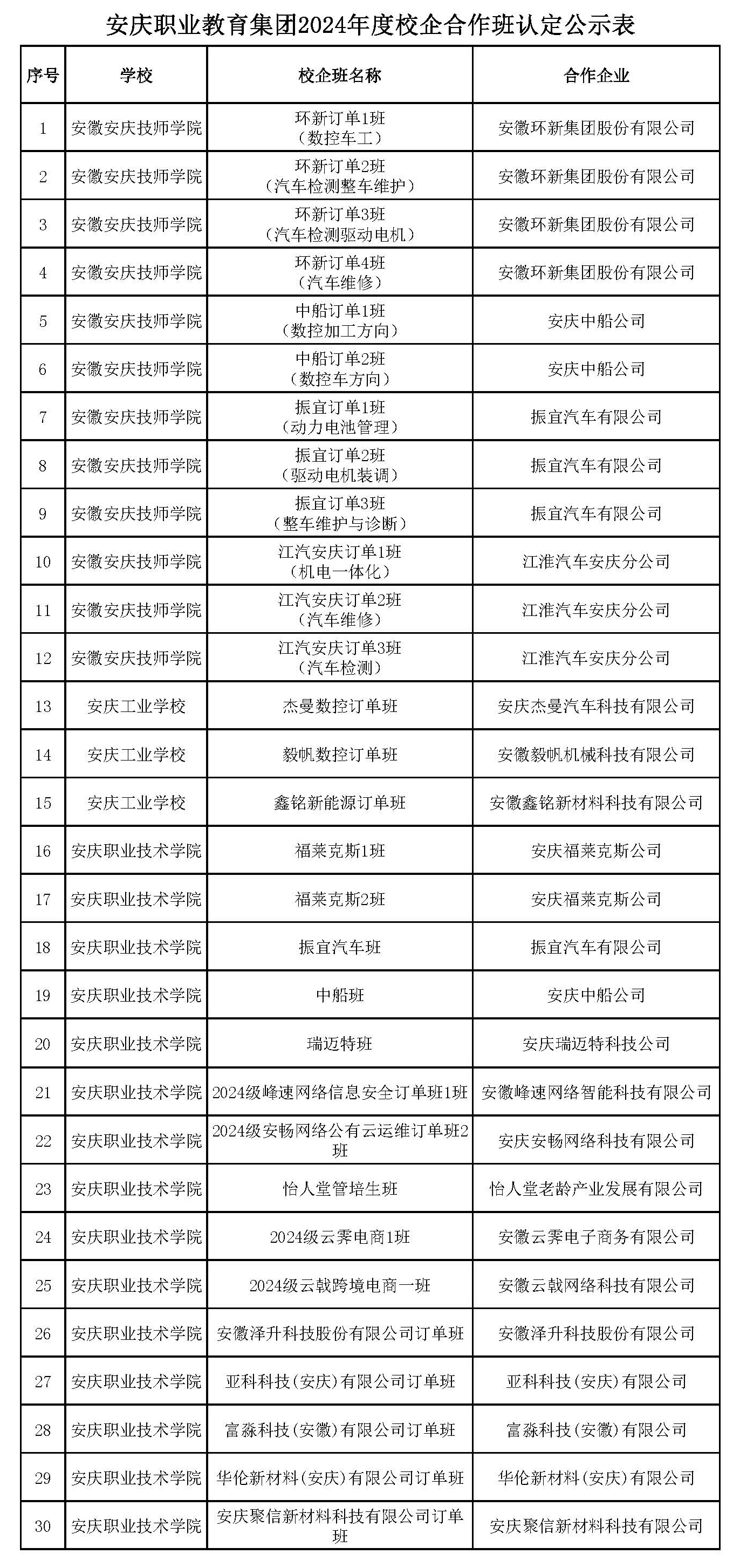 根據(jù)《關(guān)于報(bào)送招生、校企合作班項(xiàng)目獎(jiǎng)補(bǔ)資金申報(bào)材料的通知》(安職集團(tuán)〔2024〕4號)等相關(guān)文件要求,集團(tuán)秘書處組織開展了2024年度招生、省級市域產(chǎn)教聯(lián)合體、校企合作班項(xiàng)目評審工作,制定出臺《安慶職業(yè)教育集團(tuán)2024年度招生、省級市域產(chǎn)教聯(lián)合體、校企合作班評審工作實(shí)施方案》,成立評審工作領(lǐng)導(dǎo)小組,設(shè)立評委會(huì),遴選評審專家,并嚴(yán)格按照《關(guān)于印發(fā)〈安慶職業(yè)教育集團(tuán)財(cái)政獎(jiǎng)補(bǔ)資金認(rèn)定管理辦法〉的通知》(教體高〔2024〕185號)文件對各校提供的項(xiàng)目申報(bào)材料進(jìn)行了評審,認(rèn)定結(jié)果現(xiàn)予公示。