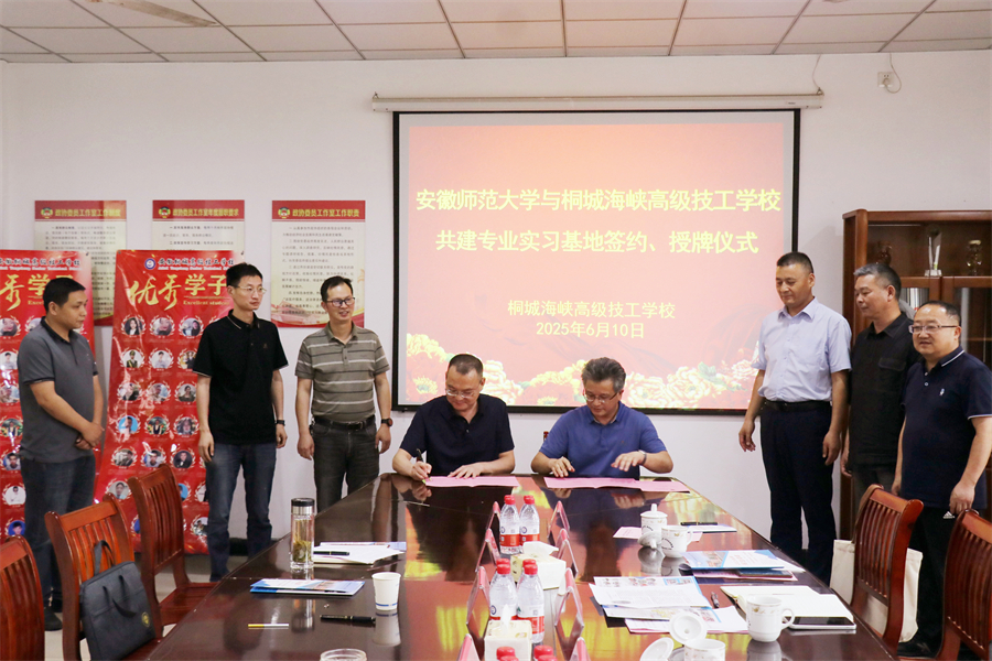 會上舉行了隆重的簽約授牌儀式,安師大生態與環境學院院長胡好遠與桐城海峽高級技工學校校長郭昌盛分別代表雙方簽署合作協議,并進行了現場授牌。