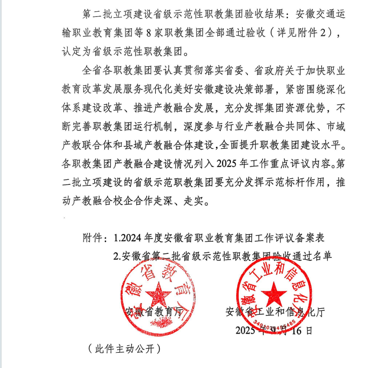 近日,安徽省教育廳、安徽省工業(yè)和信息化廳共同發(fā)文,安慶職教集團(tuán)在全省63家職教集團(tuán)2024年度工作運(yùn)行情況綜合評價中,以卓越的表現(xiàn)和顯著的成果再度獲評安徽省A類職教集團(tuán),實(shí)現(xiàn)連續(xù)七年榮獲安徽省A類職教集團(tuán)稱號。