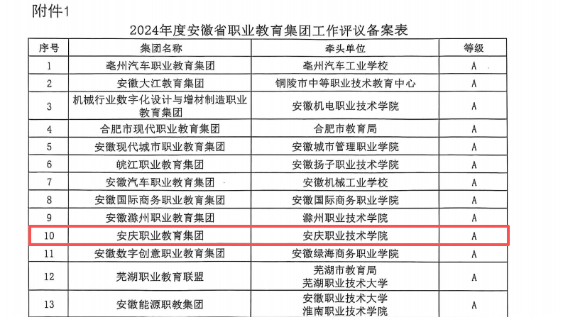 安慶職教集團(tuán)連續(xù)七年獲評安徽省A類職教集團(tuán)