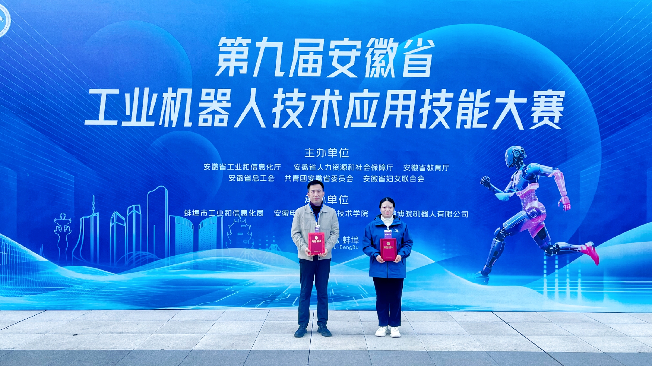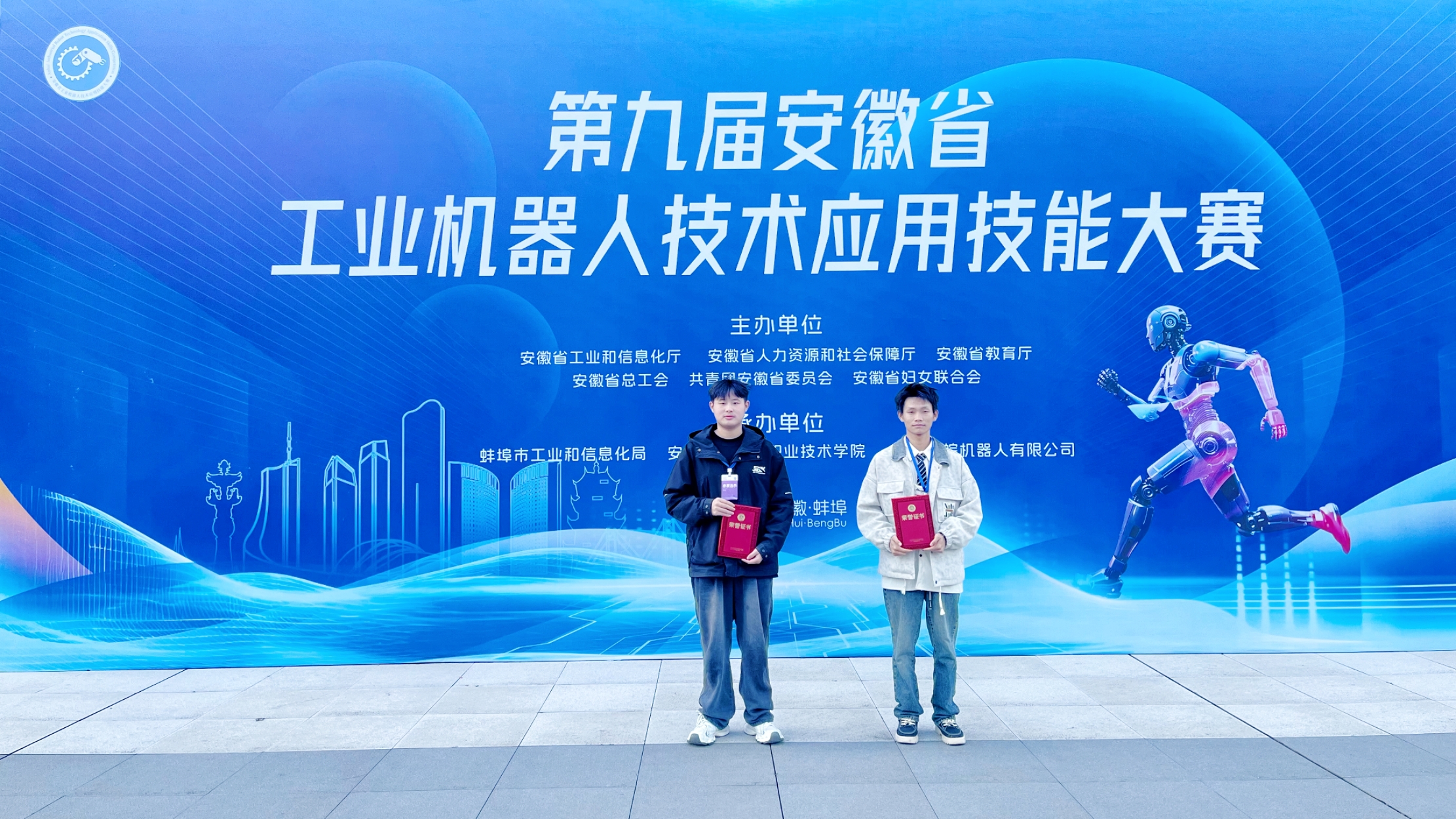 11月21日,由安徽省經濟和信息化廳、省人力資源和社會保障廳、省教育廳等七部門聯合主辦的第九屆安徽省工業機器人技術應用技能大賽在蚌埠安徽電子信息職業技術學院閉幕。安慶職業技術學院機電工程學院師生再創佳績,姚兆鳳、張嘯川兩位老師榮獲教師組二等獎。許凱華、王濤兩位同學獲得學生組三等獎。