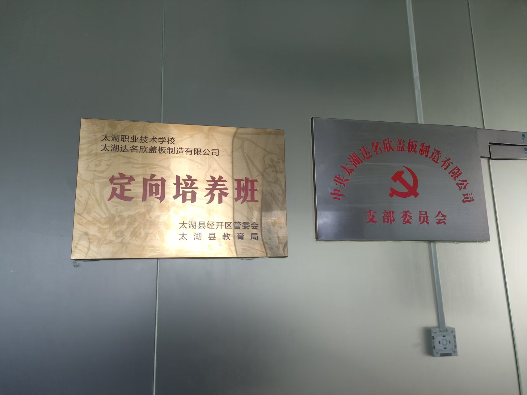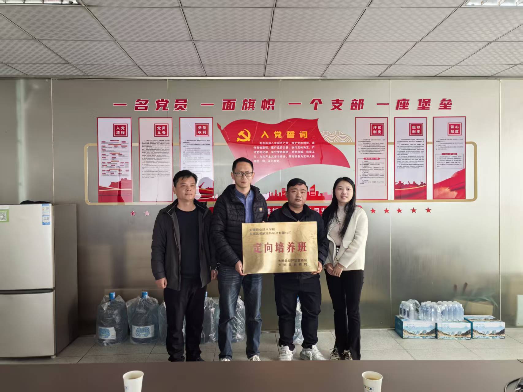 11月26日,太湖職業技術學校與太湖達名欣蓋板制造有限公司聯合舉辦“企業定向培養班”,并舉行授牌儀式。儀式在達名欣公司黨員活動室舉行,太湖縣經開區經發局主要負責同志、學校分管負責同志,以及三方代表齊聚現場,共同開啟政校企合作新篇章。